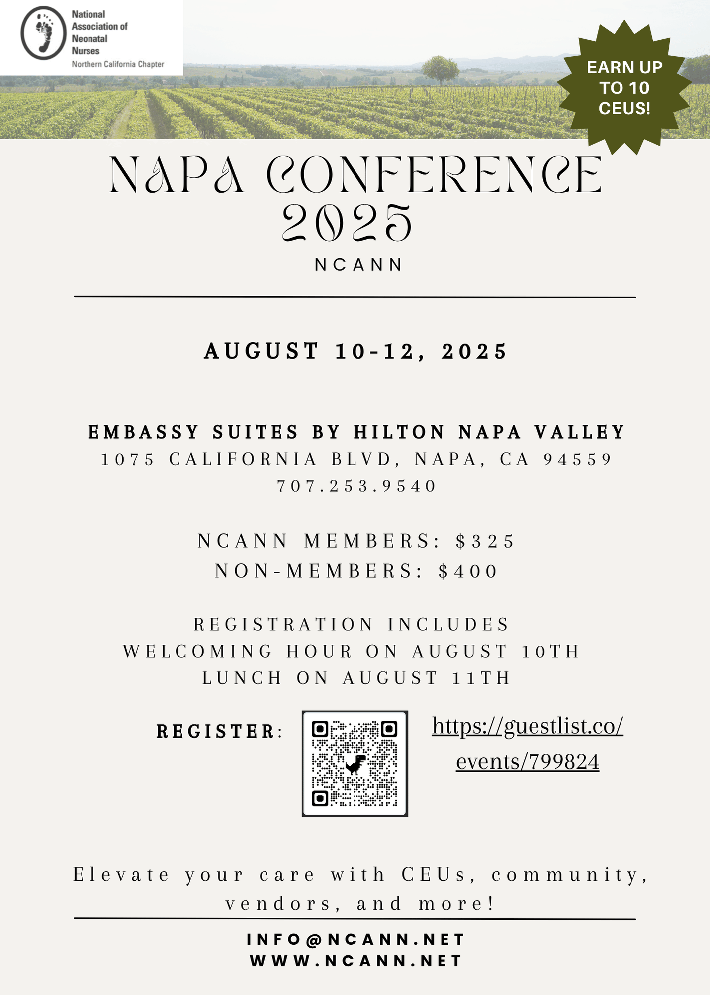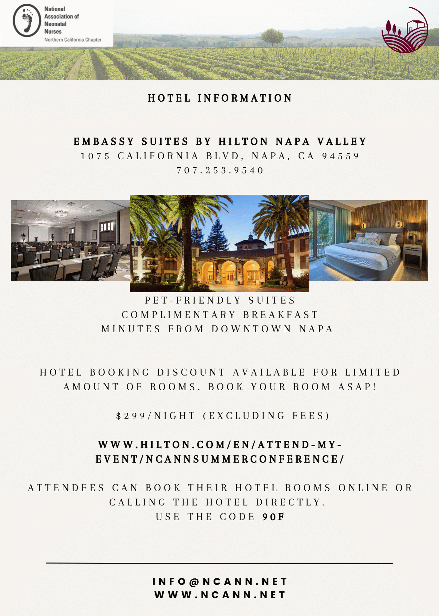 There is a 2-night minimum stay. Reserve a room in our reduced-rate block at the beautifully remodeled Embassy Suites by Hilton Napa Valley